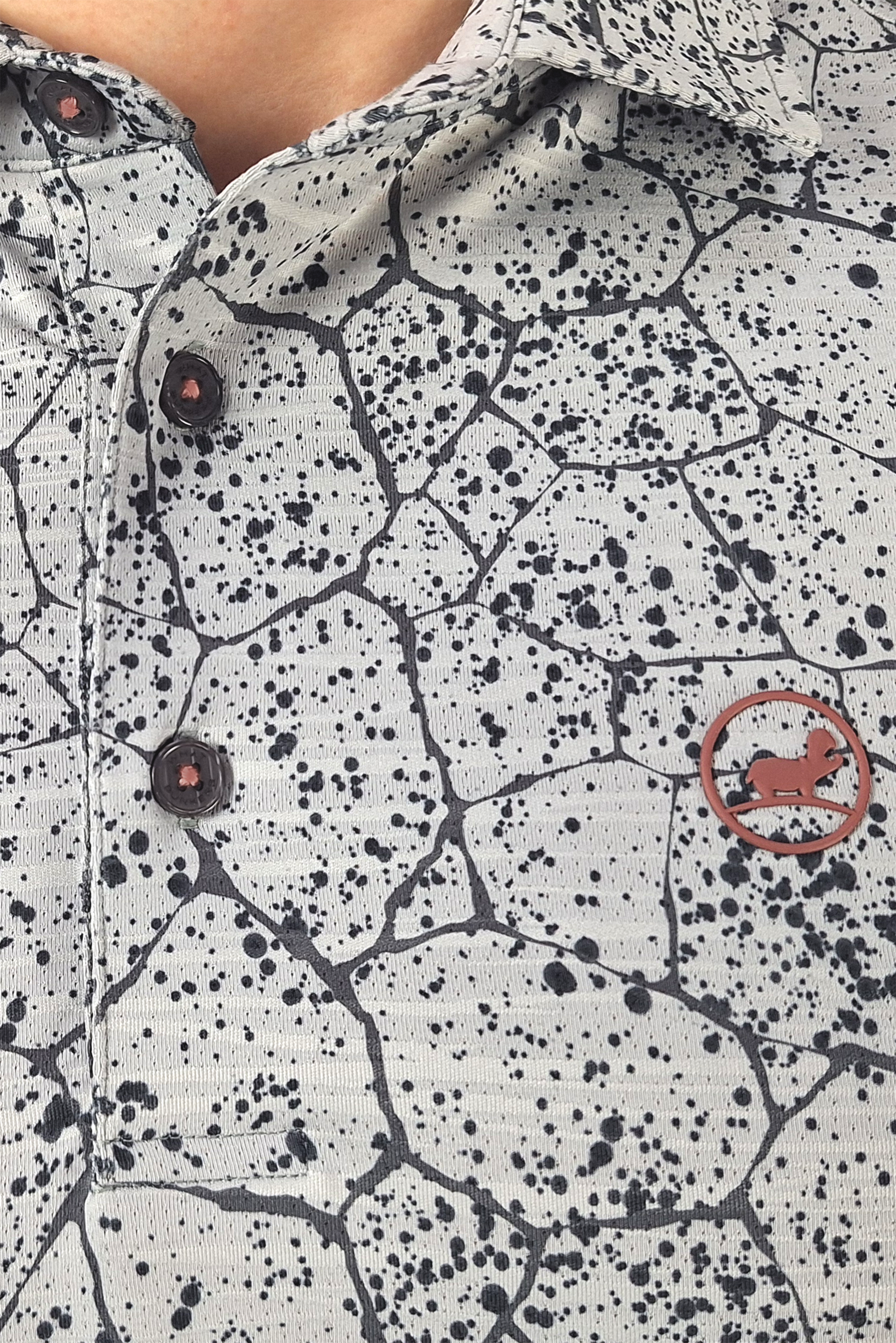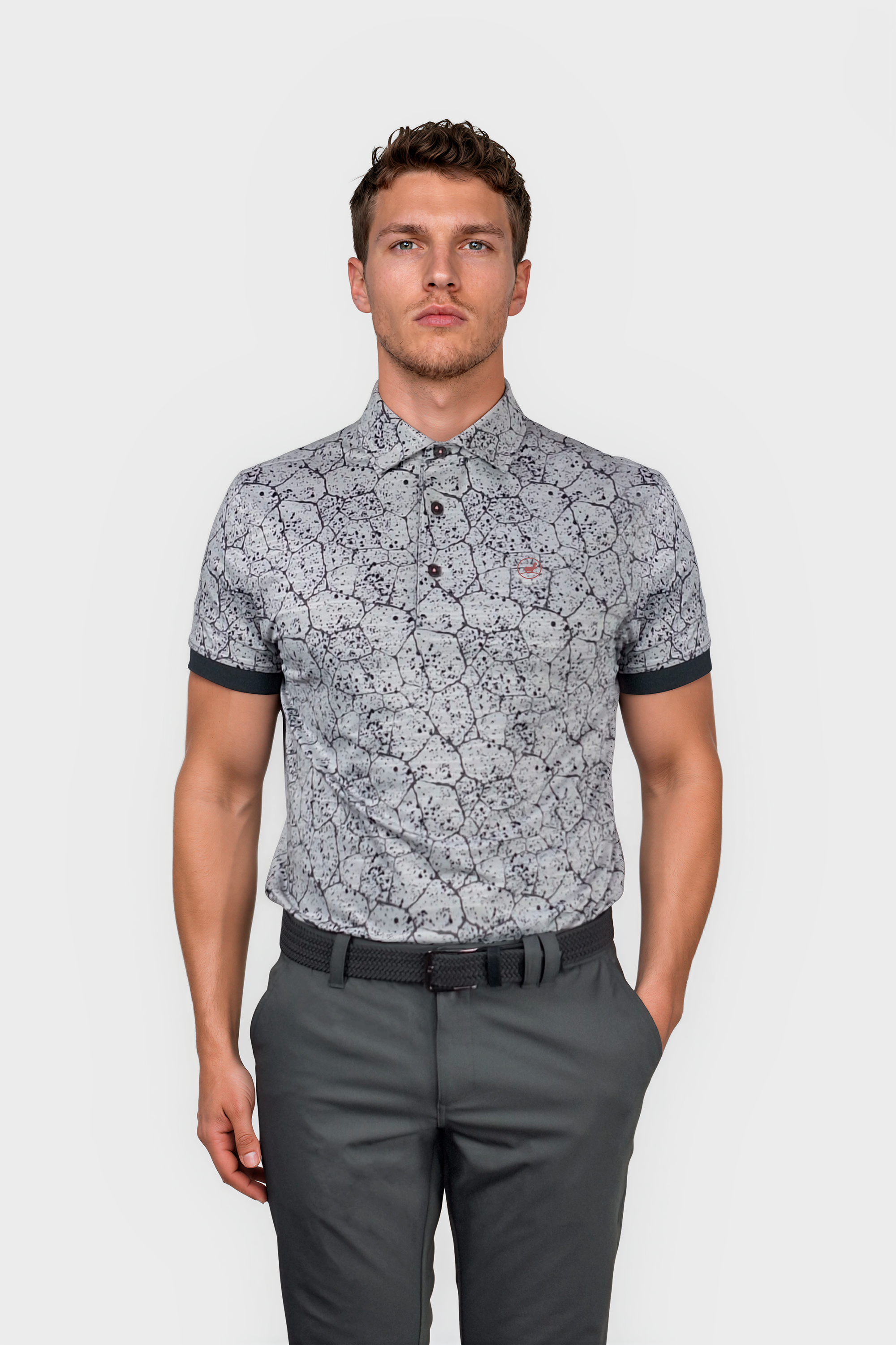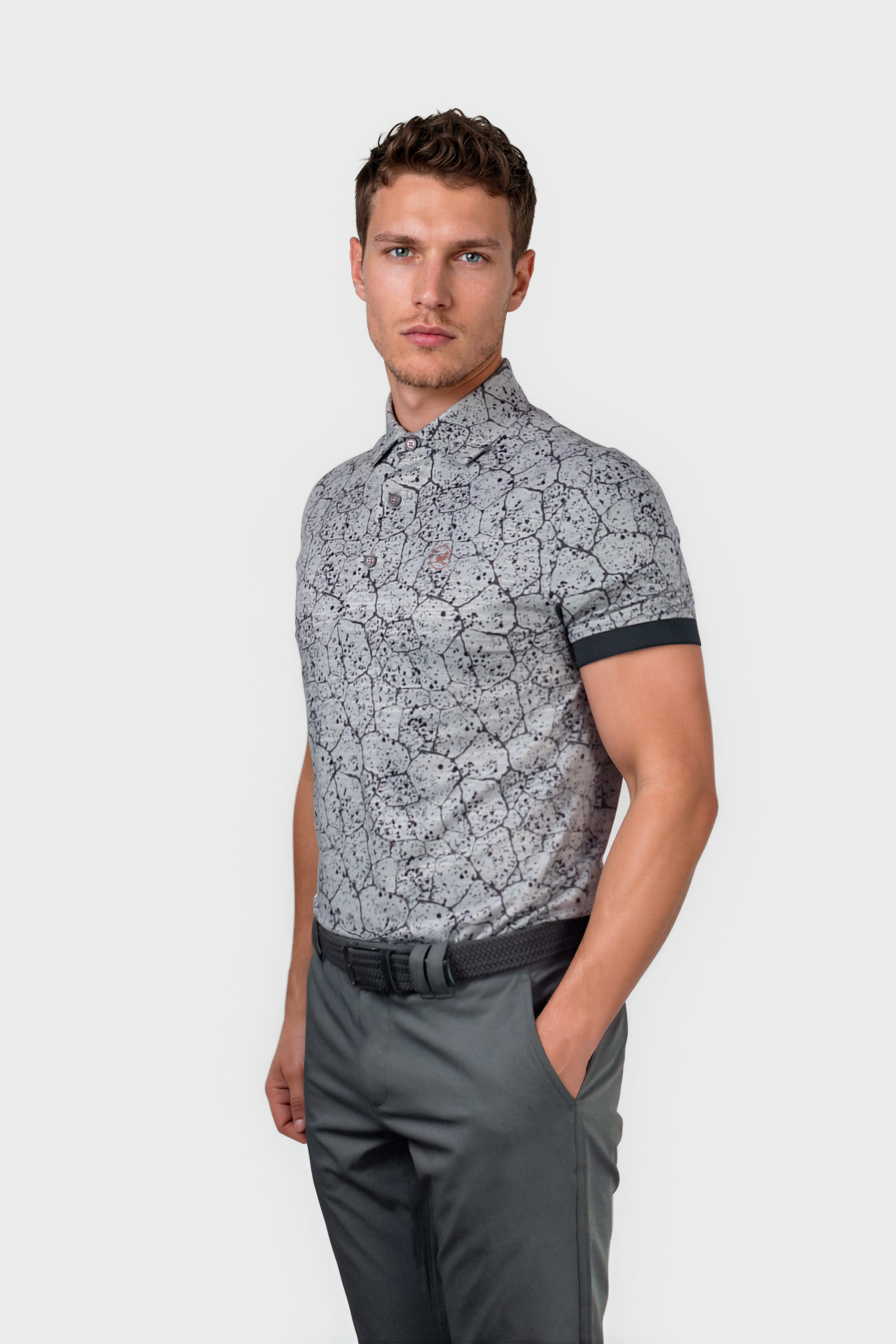 Experience ultimate comfort and style with our WBJasper golf polo shirt in grey. The graphic splatter pattern adds a unique touch, while the super 4 way stretch and lightweight material provide maximum flexibility and breathability. Completed with rib cuffs for a perfect fit.