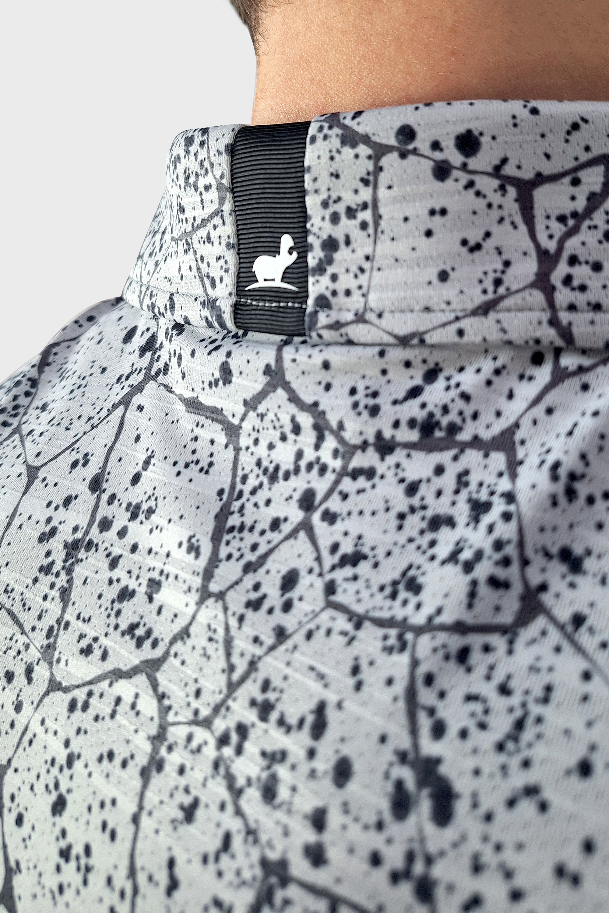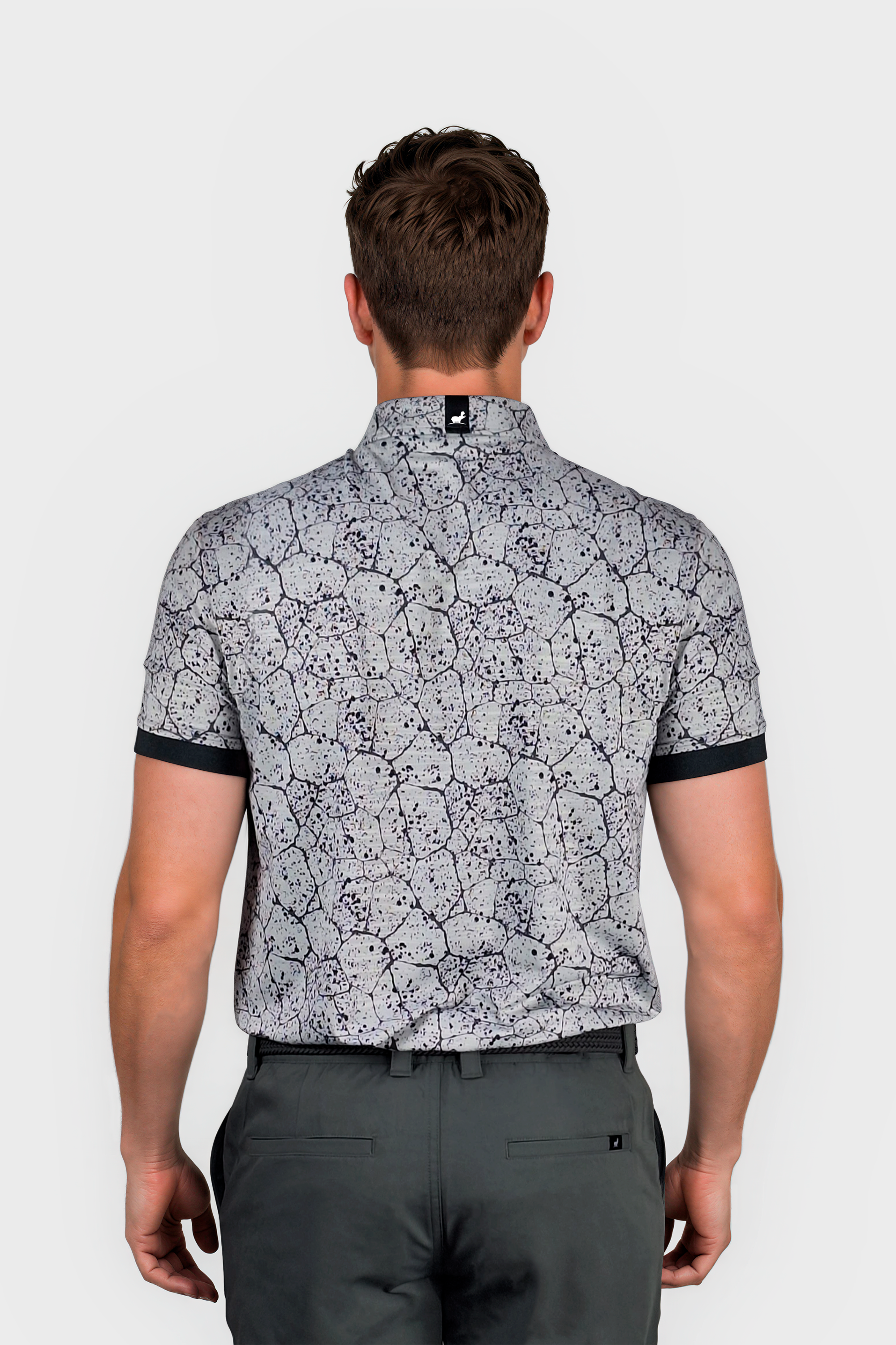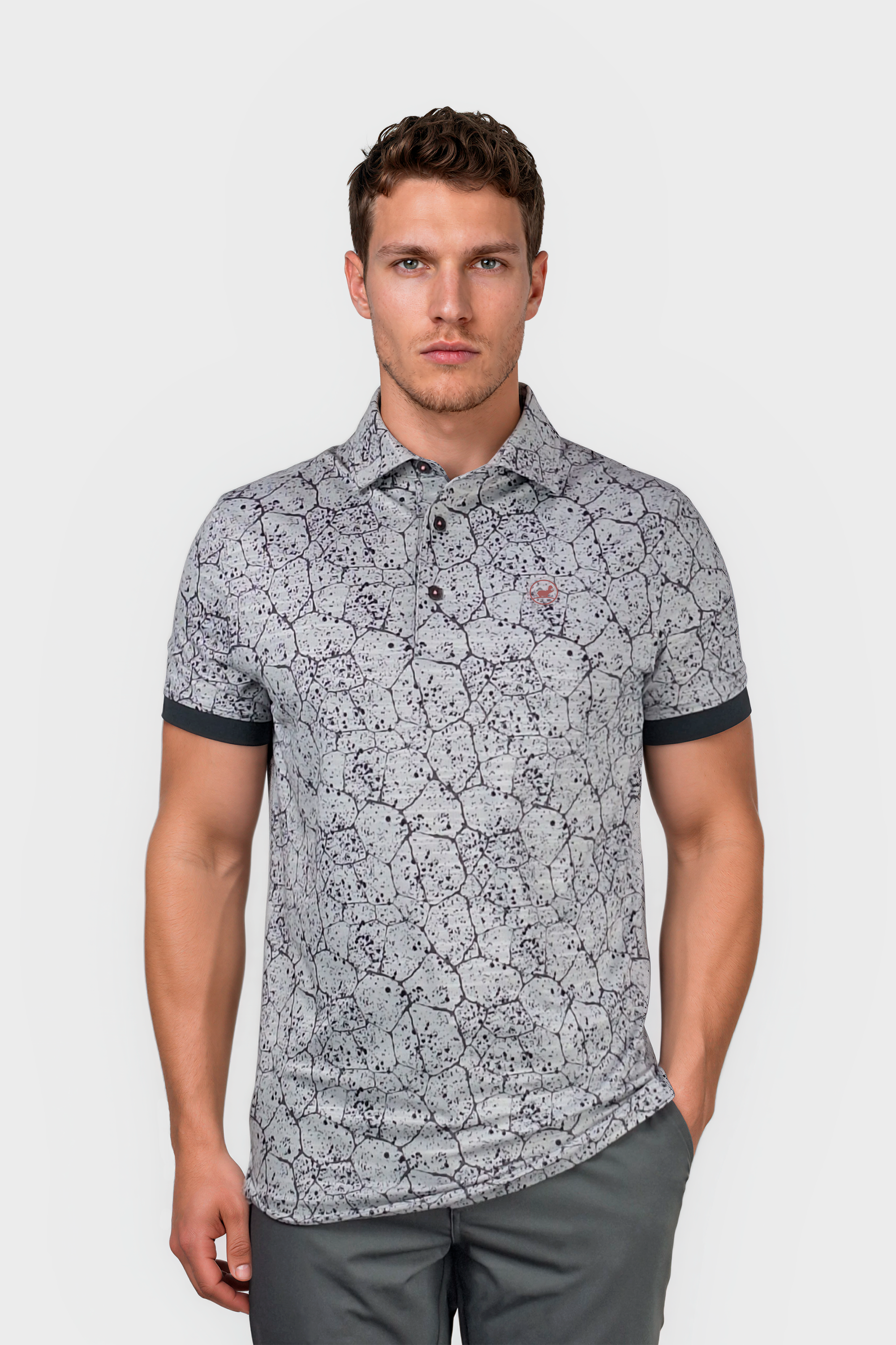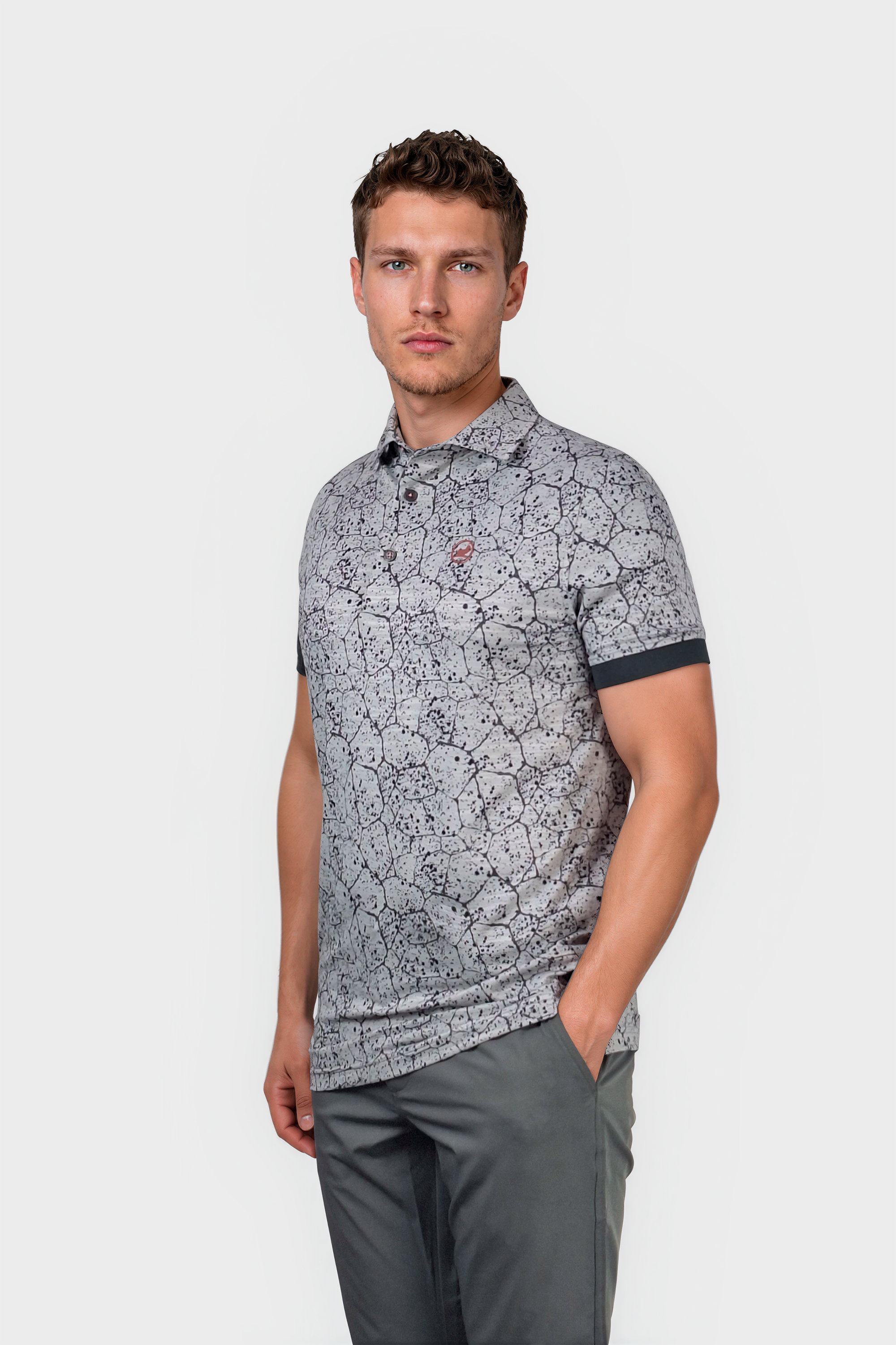 Experience ultimate comfort and style with our WBJasper golf polo shirt in grey. The graphic splatter pattern adds a unique touch, while the super 4 way stretch and lightweight material provide maximum flexibility and breathability. Completed with rib cuffs for a perfect fit.