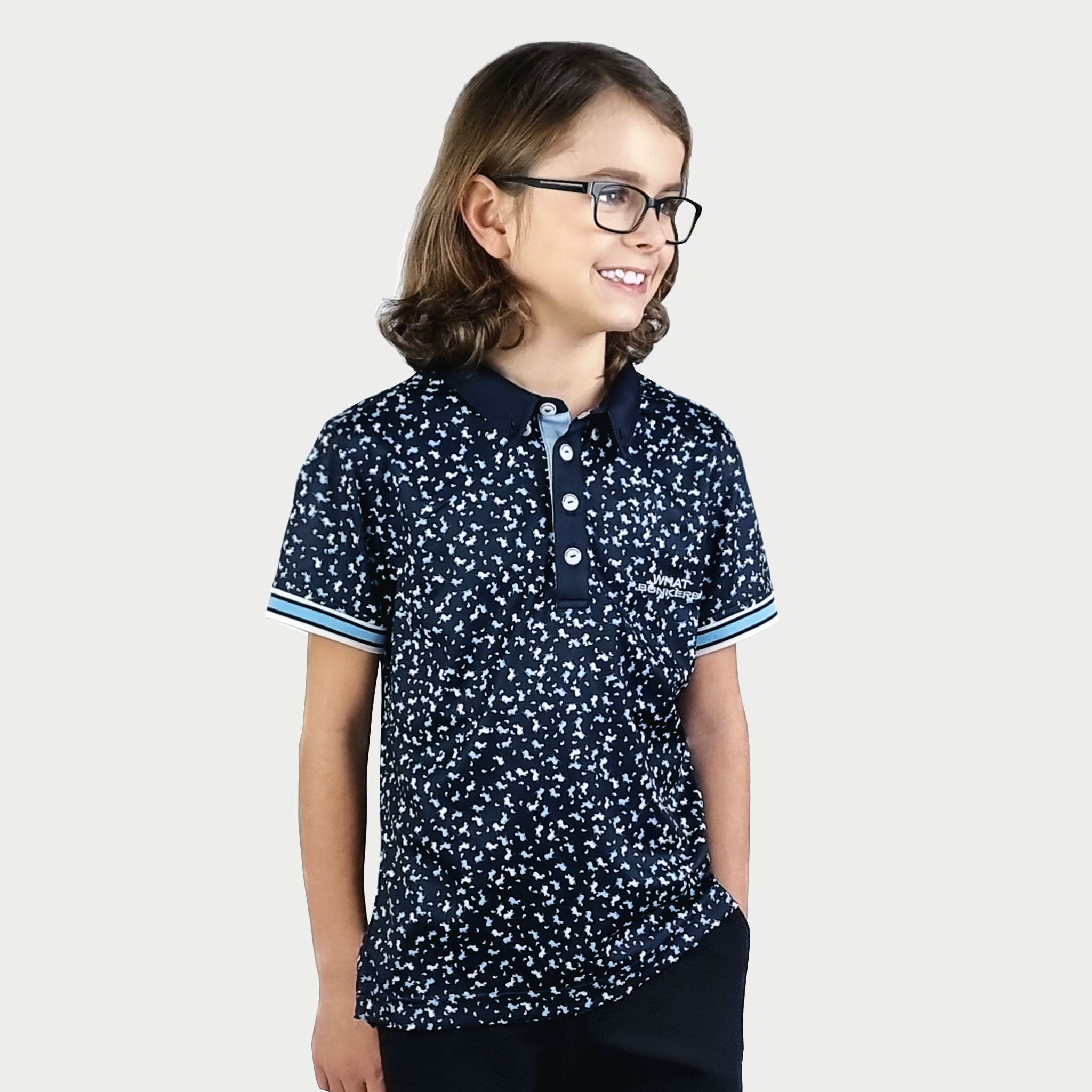 Cool and classy golf polo shirt for juniors. Rib cuffs and an allover Hippo print. From a distance the pattern looks random - closeup you will find the Hippo in different colors and sizes scattered all over the shirt.