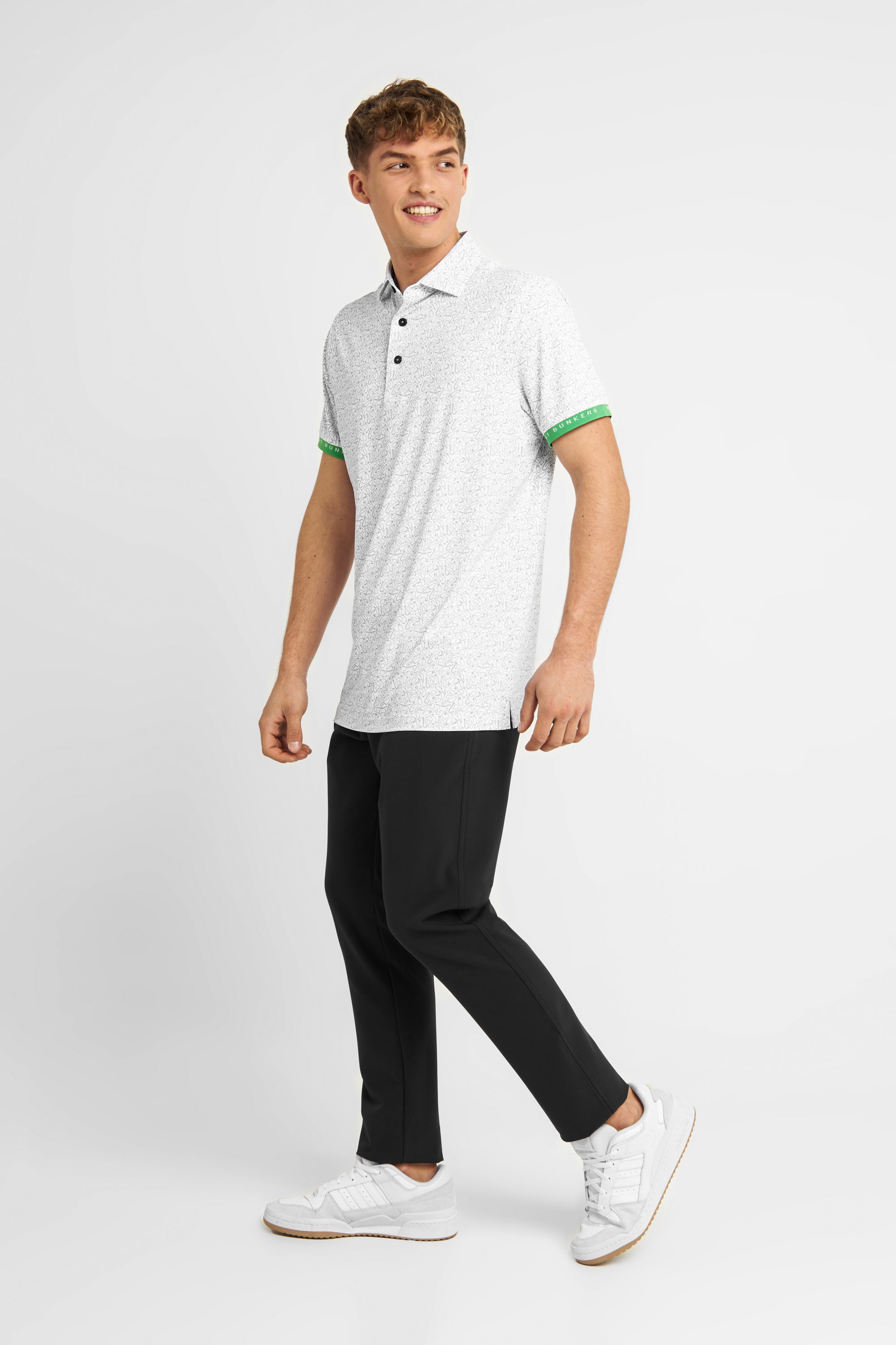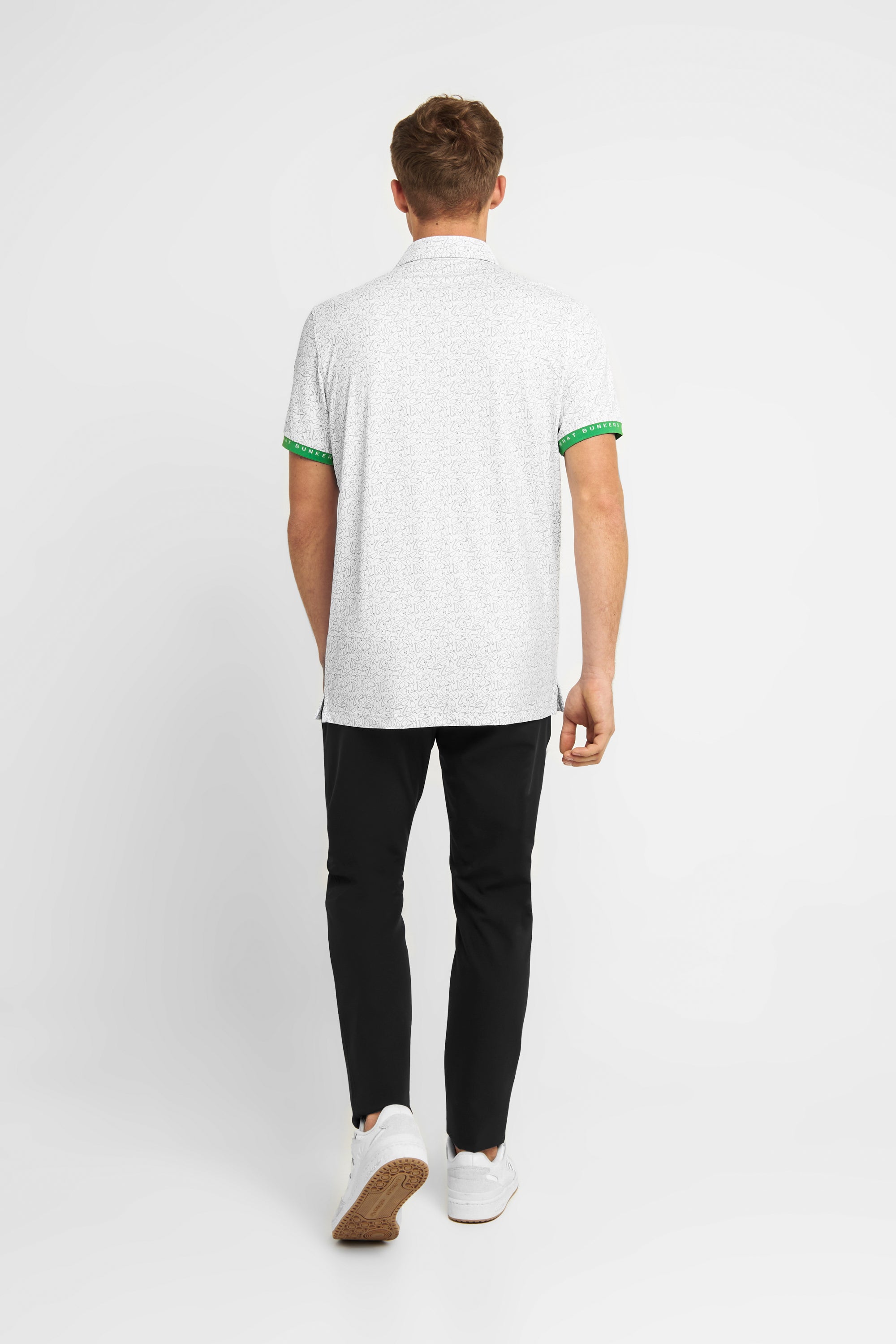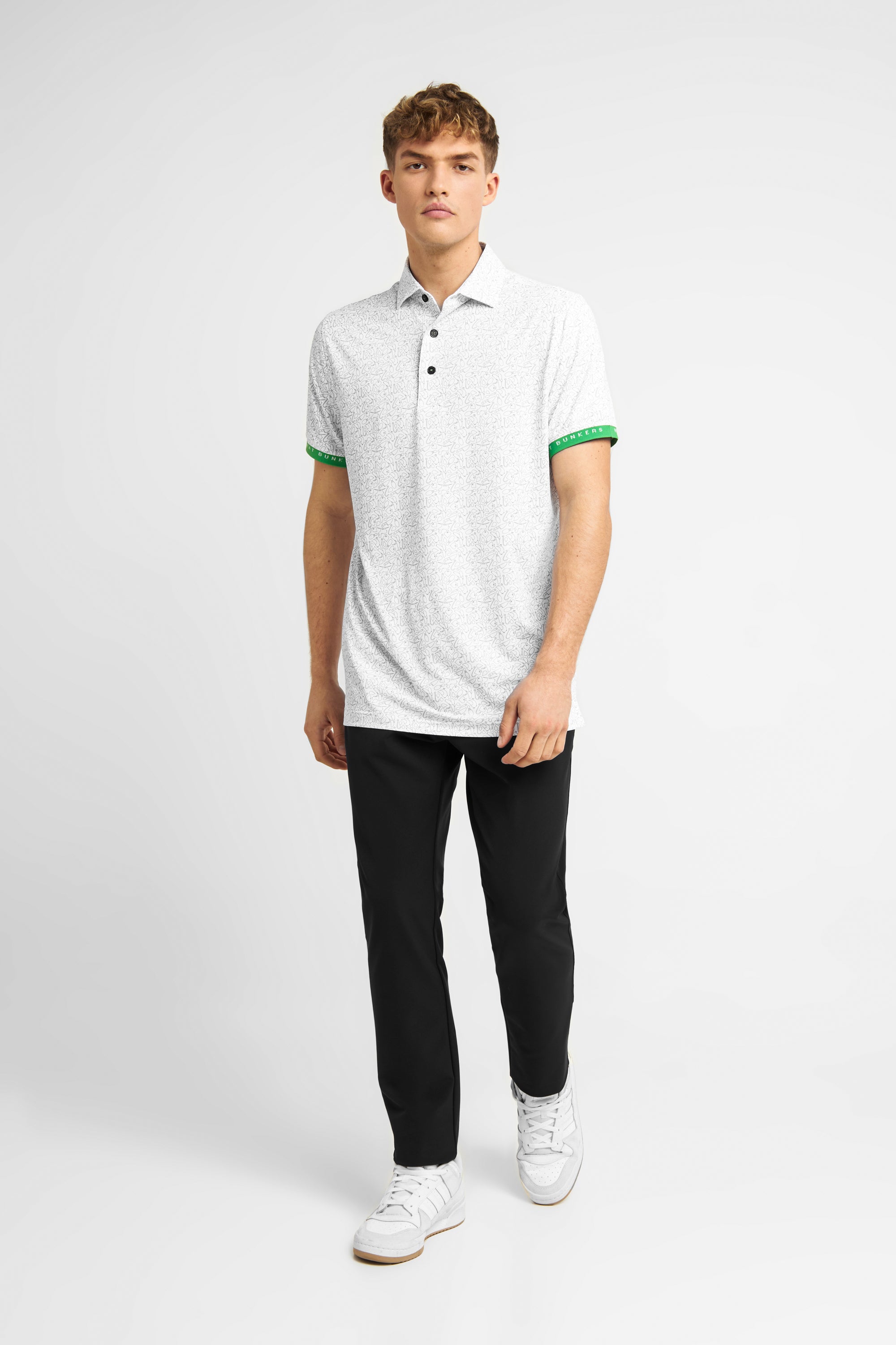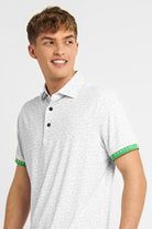 The Joel polo shirt in white/charcoal features a stretch fabric for unrestricted movement, lightweight design for ultimate breathability, and signature "golf lingo" pattern for added style. Don't forget the green sleeve cuffs, a classic touch for the avid golfer.
