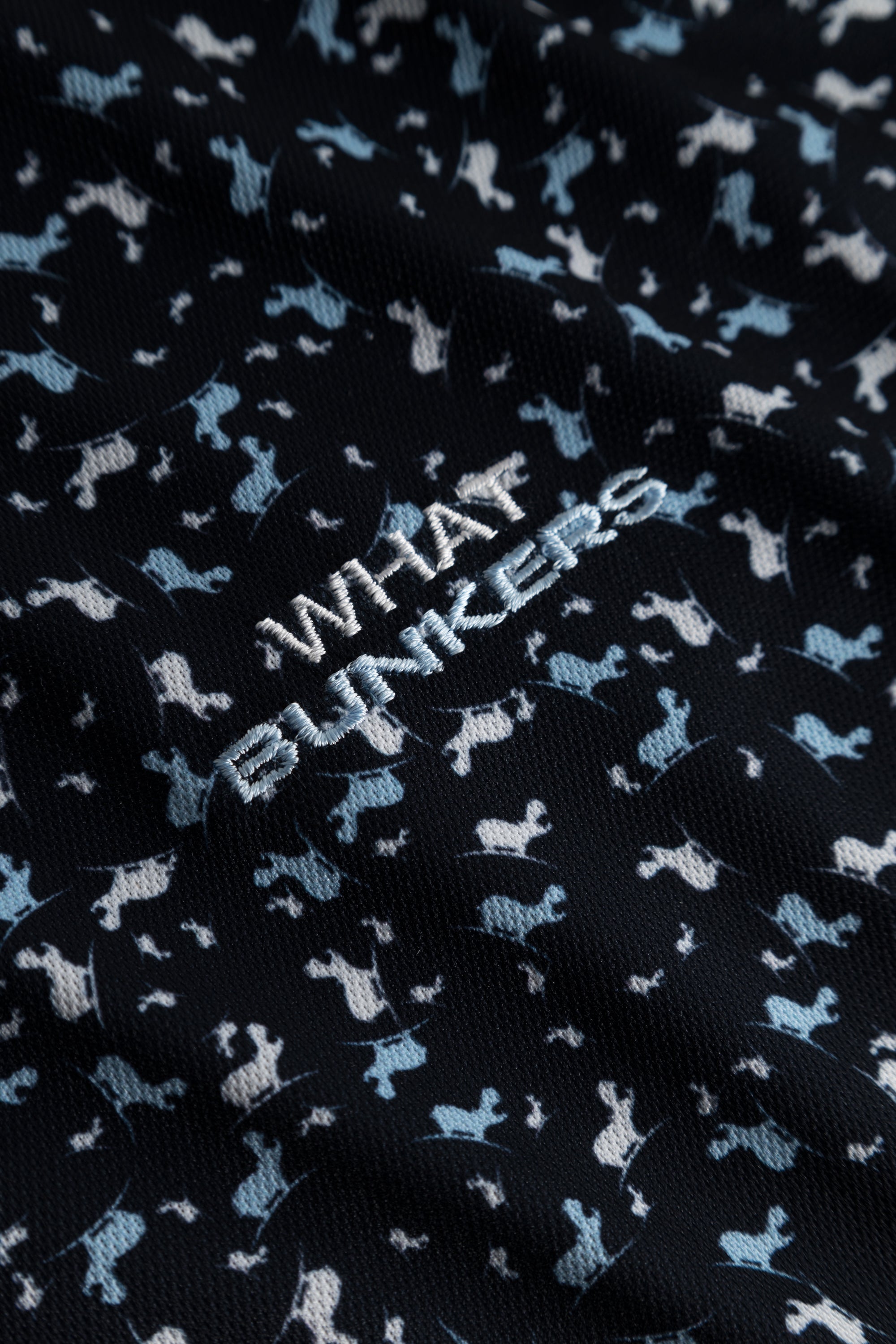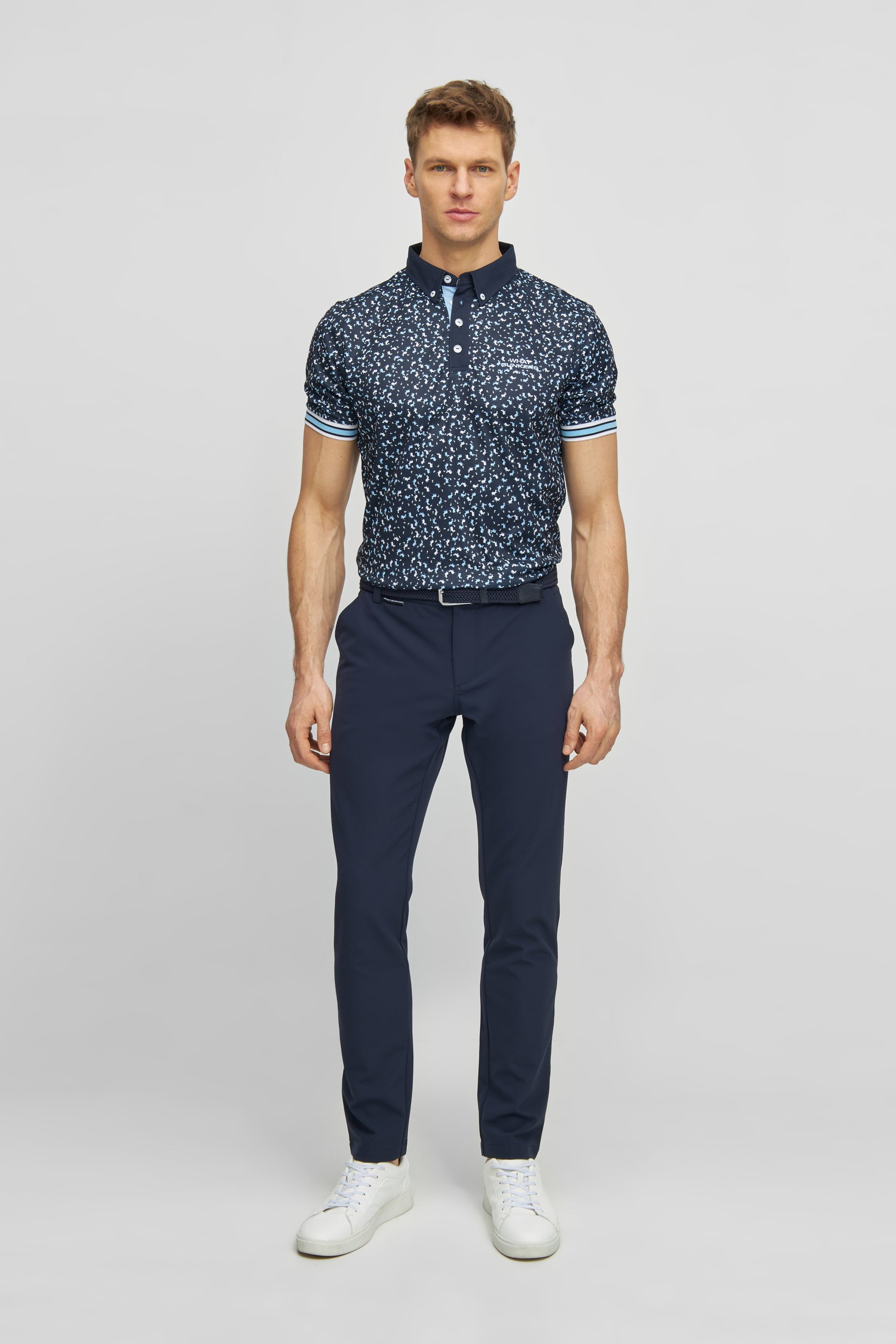 Cool and classy golf polo shirt for men. Rib cuffs and an allover Hippo print. From a distance the pattern looks random - closeup you will find the Hippo in different colors and sizes scattered all over the shirt.